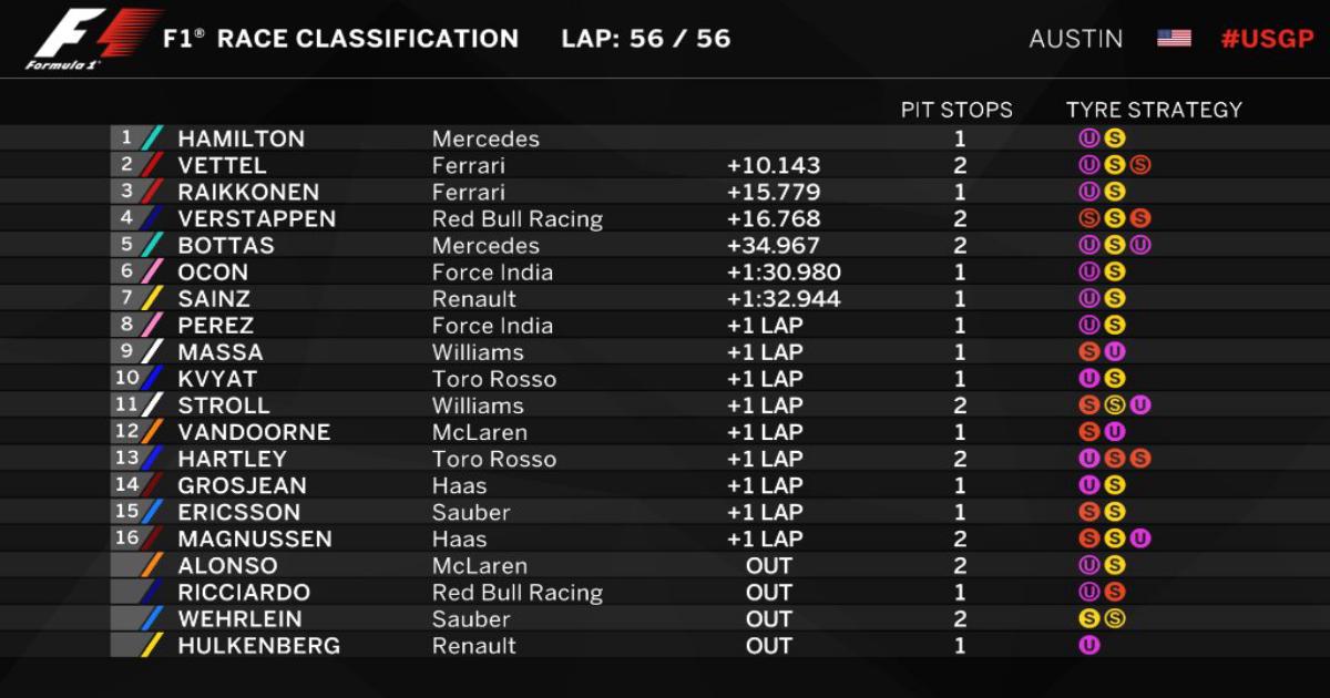 Гран-при США. Хэмилтон выиграл гонку, Феттель – второй, Райкконен – третий, Квят – 10-й