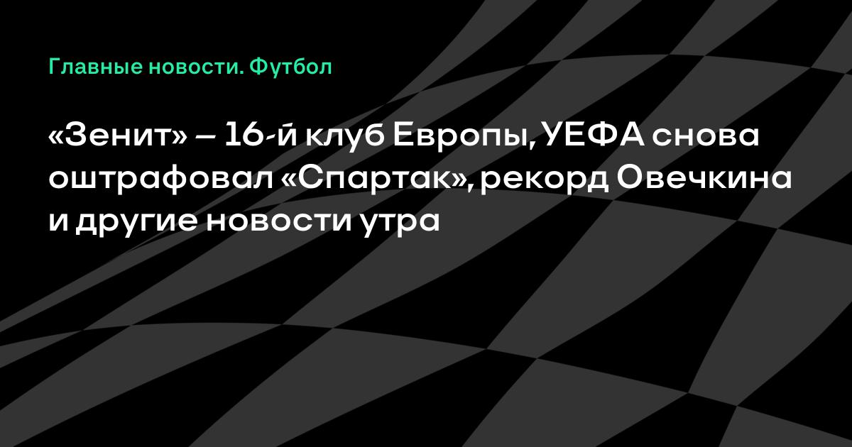 «Зенит» – 16-й клуб Европы, УЕФА снова оштрафовал «Спартак», рекорд Овечкина и другие новости утра