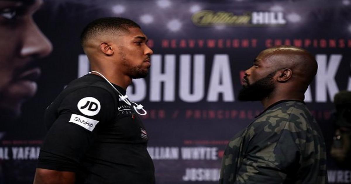 Чемпион мира по версиям WBA и IBF в супертяжелом весе Энтони Джошуа и Карлос Такам провели дуэль взглядов перед боем, который пройдет 28 октября в Кардиффе.