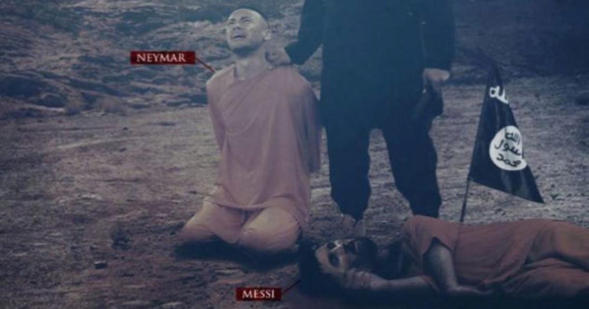 На пропагандистских плакатах изображены форвард «ПСЖ» Неймар и лидер «Барселоны» Лионель Месси. Они изображены в оранжевой робе (в такой ИГ обычно выводит людей на казни).