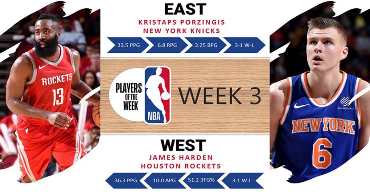 Защитник «Рокетс» Джеймс Харден и форвард «Никс» Кристапс Порзингис признаны лучшими игроками недели в Западной и Восточной конференциях НБА соответственно.