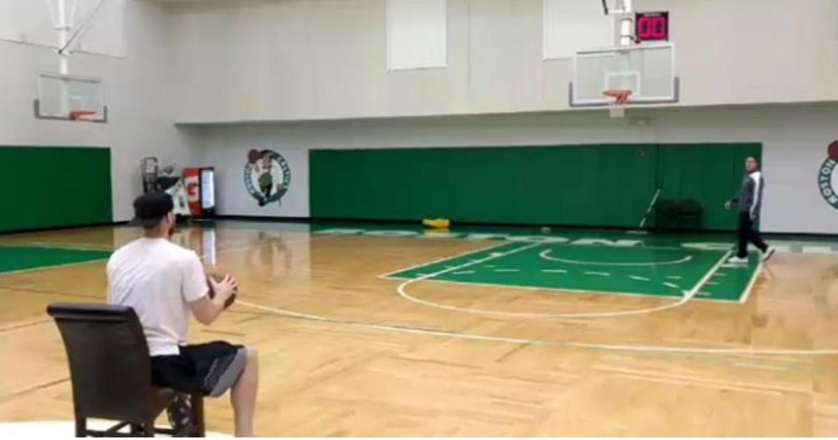 Форвард «Бостона» Гордон Хэйворд во время посещения тренировочного зала команды забил с середины площадки из кресла.