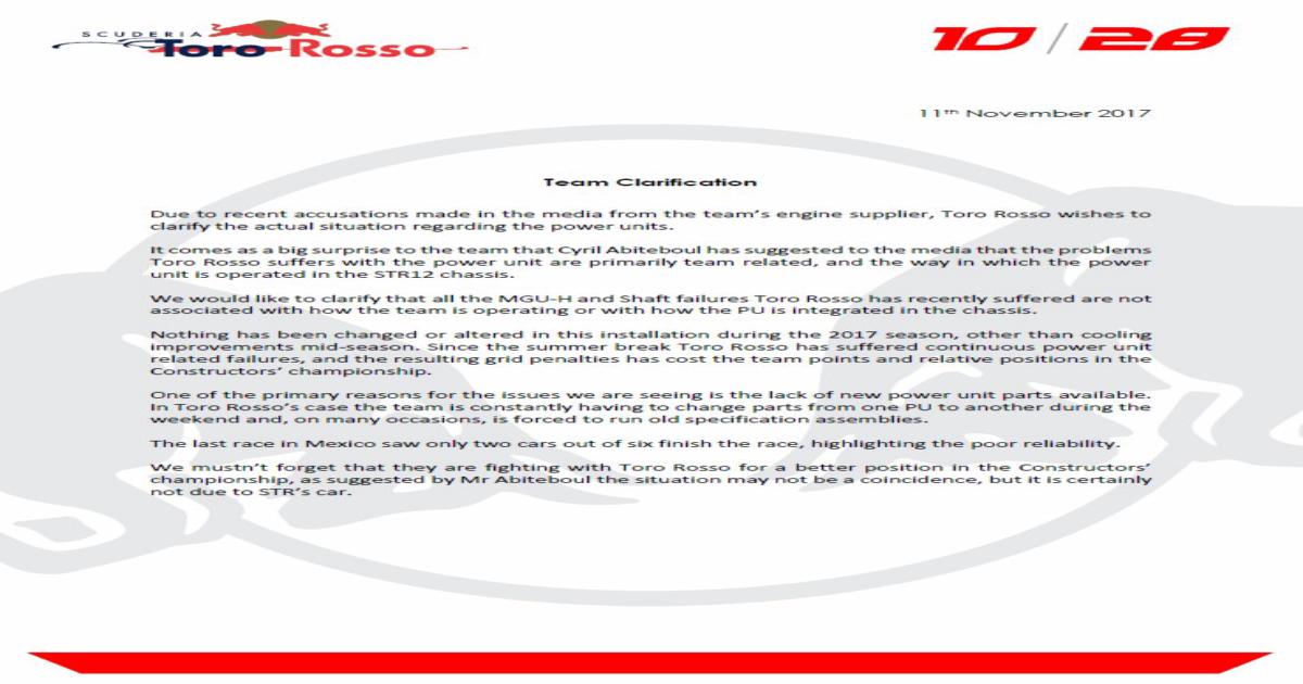Команда «Торо Россо» выпустила официальный релиз, в котором отметила, что мотористы «Рено» не должны возлагать вину за поломки силовых установок на итальянскую конюшню.