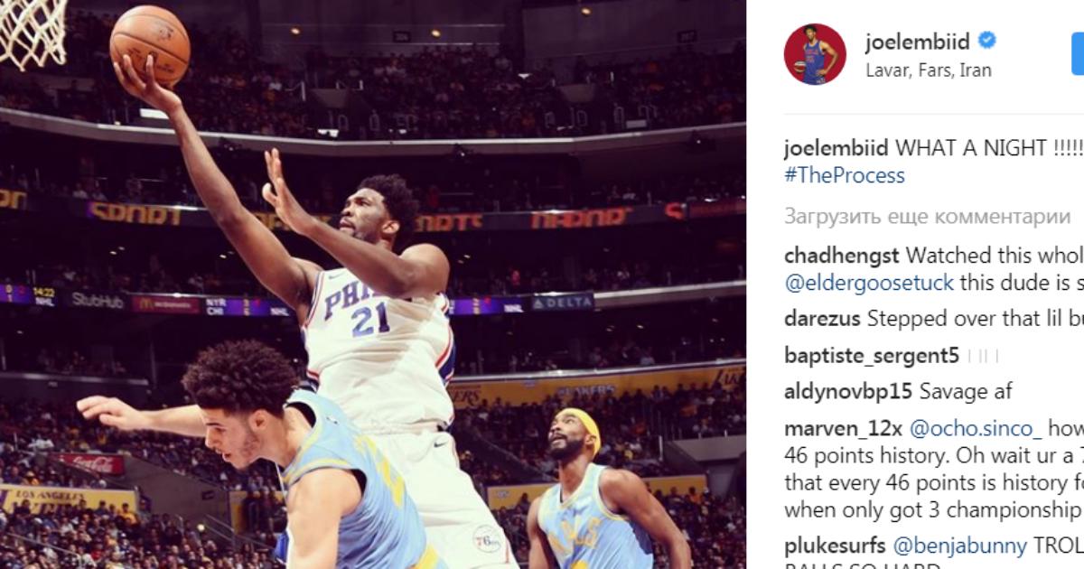 После игры Эмбиид выложил в инстаграм фотографию с матча, на которой он изображен отправляющим мяч в кольцо на фоне Лонзо Болла. Центровой изменил свое местонахождение на иранское местечко Лавар в провинции Фарс.