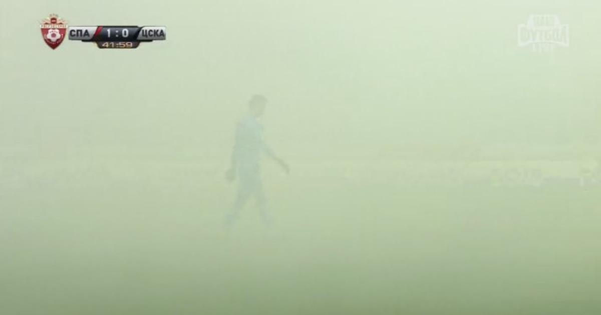 Главный арбитр встречи Алексей Николаев на две минуты останавливал игру, пока дым над полем не рассеялся.