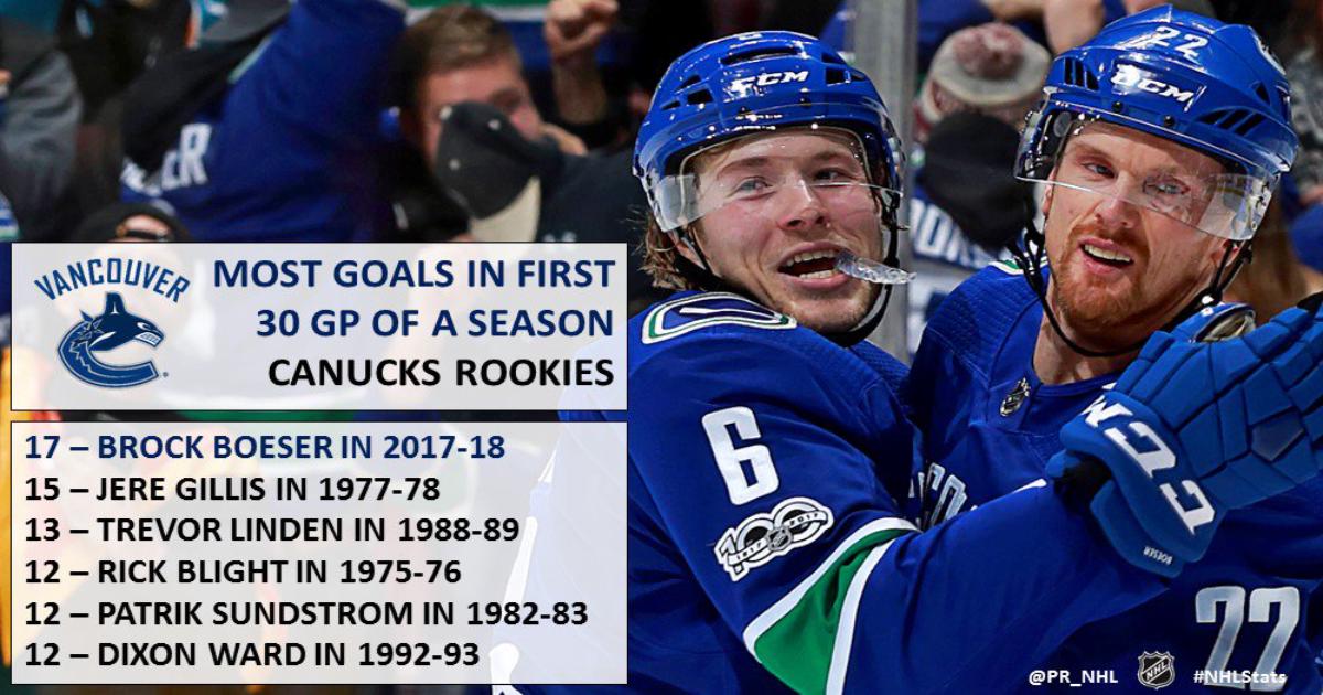 НХЛ. Босер забил 17 голов в первых 30 матчах сезона. Это лучший результат для новичка в истории «Ванкувера»
