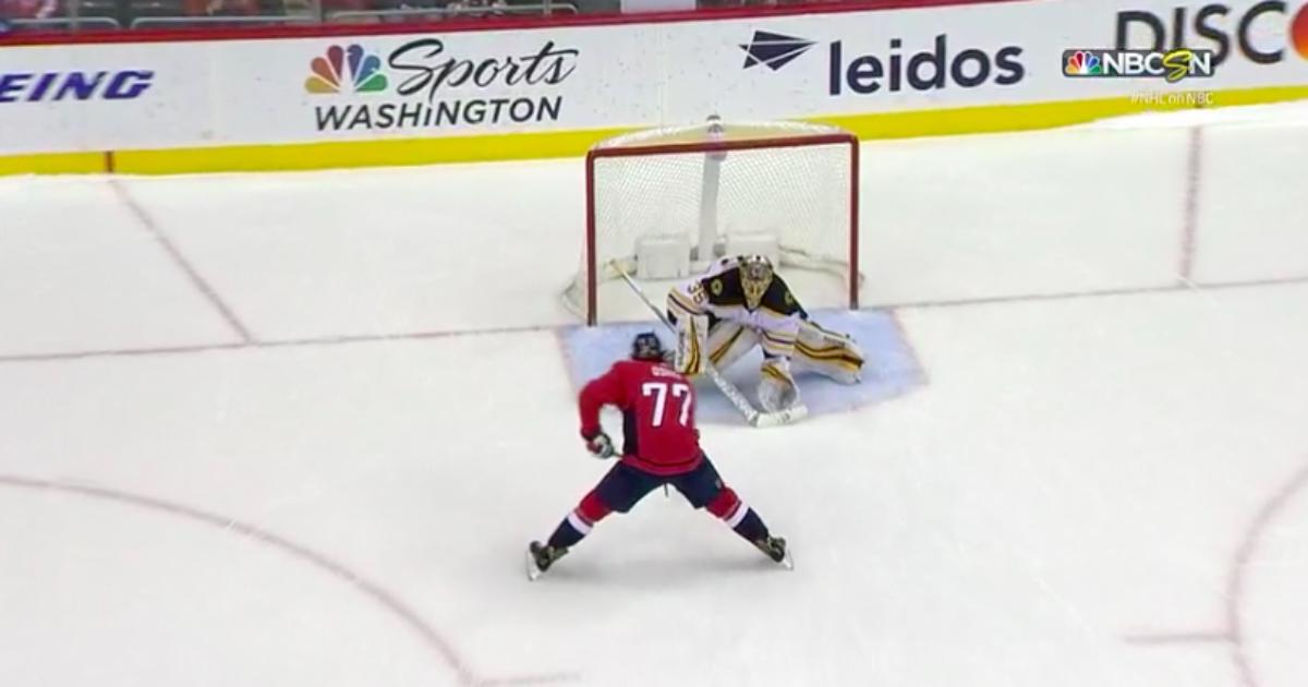 Голкипер «Бостона» Антон Худобин необычным способом отразил буллит нападающего «Вашингтона» Ти Джея Оши (3:4 Б).
