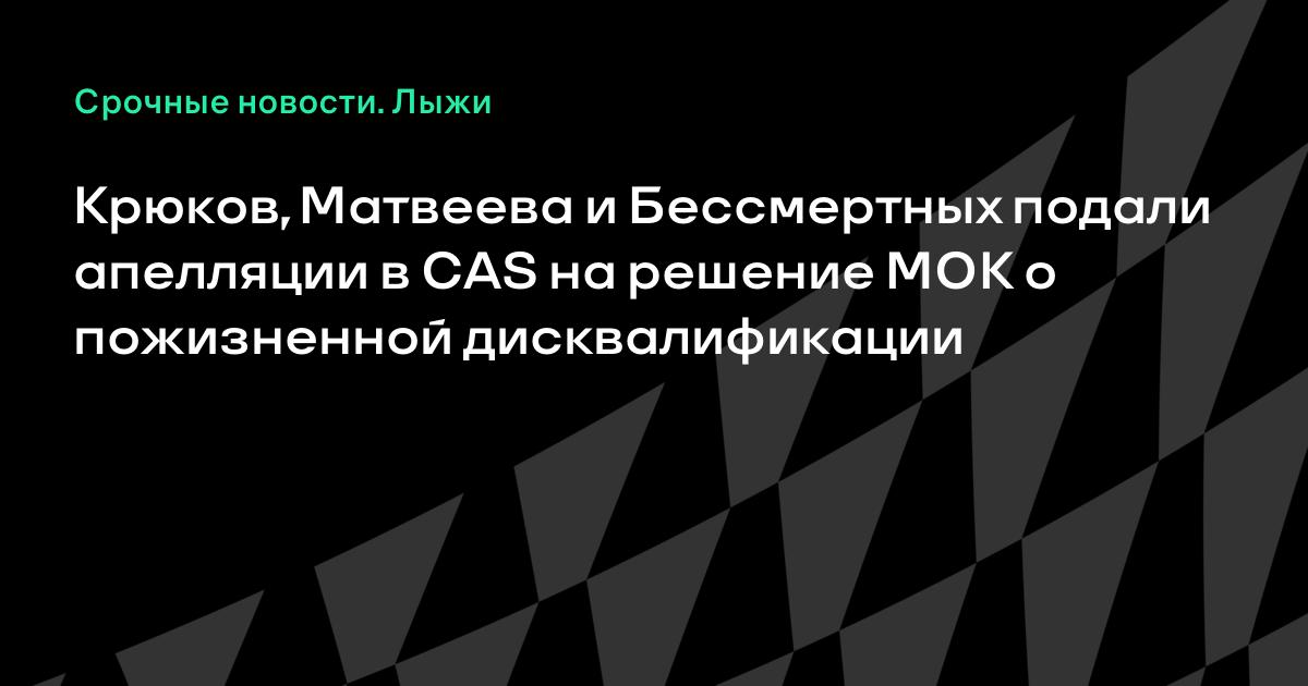 Анна Козьменко, адвокат российских лыжников Никиты Крюкова, Натальи Матвеевой и Александра Бессмертных, сообщила, что в Спортивный арбитражный суд (CAS) были поданы апелляции на решение Международного олимпийского комитета (МОК) о пожизненном отстранении россиян от Олимпиад.