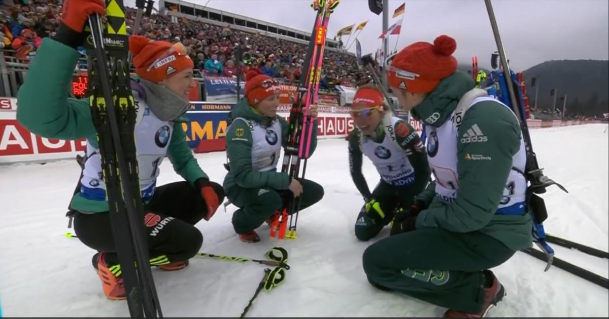 | 1 | Германия (Франциска Пройс, Дениз Херманн-Вик, Франциска Хильдебранд, Лаура Дальмайер) | 1:08.47,0 (0+9) |