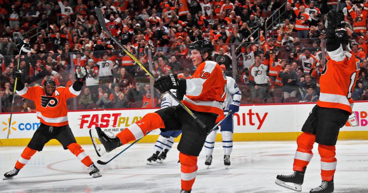 Форвард «Филадельфии» Нолан Патрик забросил шайбу в матче с «Торонто» (3:2 ОТ).