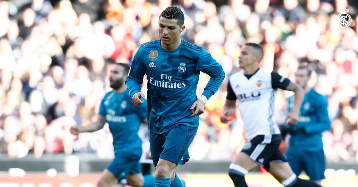 Форвард «Реала» Криштиану Роналду оформил дубль в первом тайме матча примеры против «Валенсии» (2:0, перерыв).