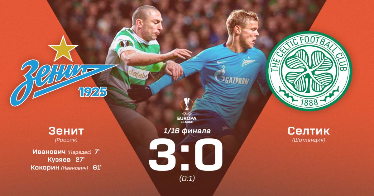 Сегодня в ответном матче 1/16 финала Лиги Европы «Зенит» разгромил «Селтик» (3:0, первый матч – 0:1) и вышел в следующий раунд.