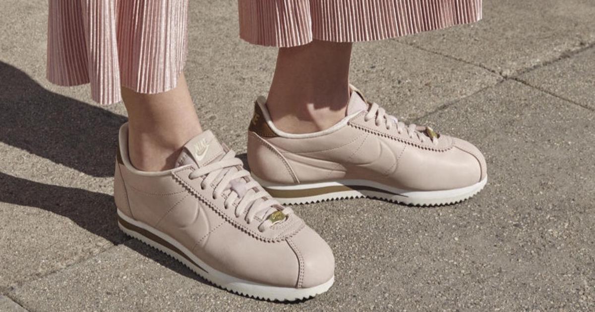 Кроссовки, названные LA Cortez, выполнены из кожи пудрового цвета с золотой отделкой на заднике и подошве.