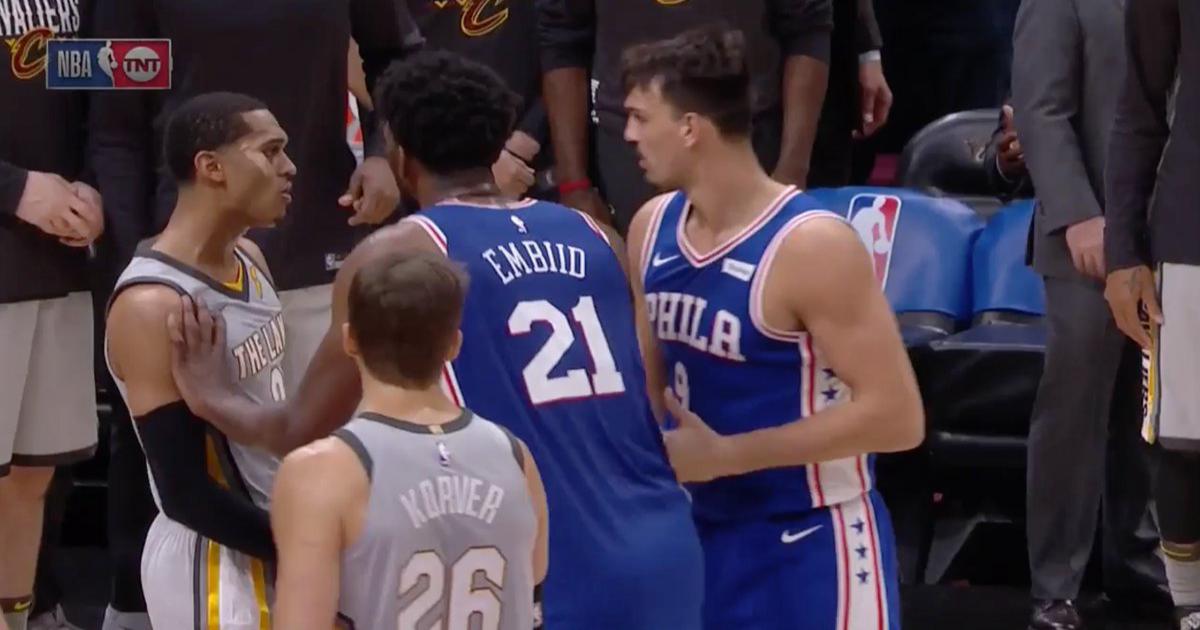 Защитник «Кливленда» Джордан Кларксон под занавес матча с «Филадельфией» (108:97) бросил мяч в спину форварда Дарио Шарича, сообщает ESPN.com.