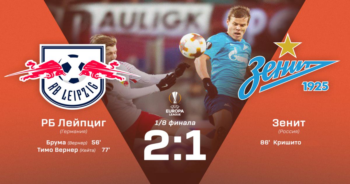 В 1/8 финала Лиги Европы «Зенит» проиграл «РБ Лейпциг» (1:2).