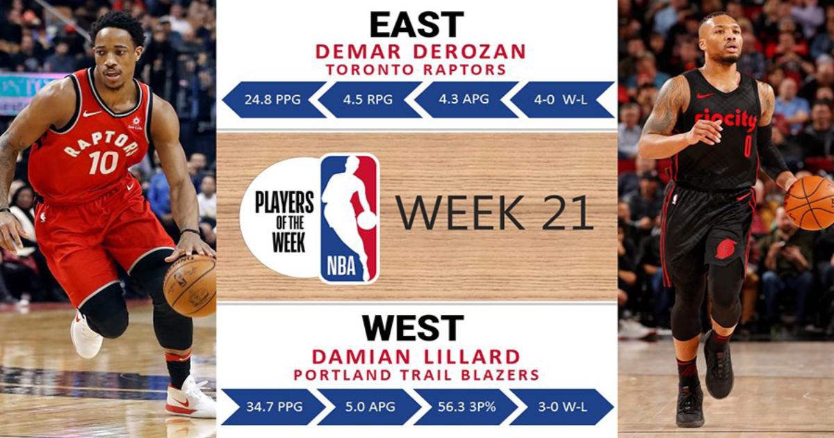 Защитник «Торонто» Демар Дерозан и разыгрывающий «Портленда» Дэмиан Лиллард признаны игроками недели в Восточной и Западной конференциях НБА соответственно.