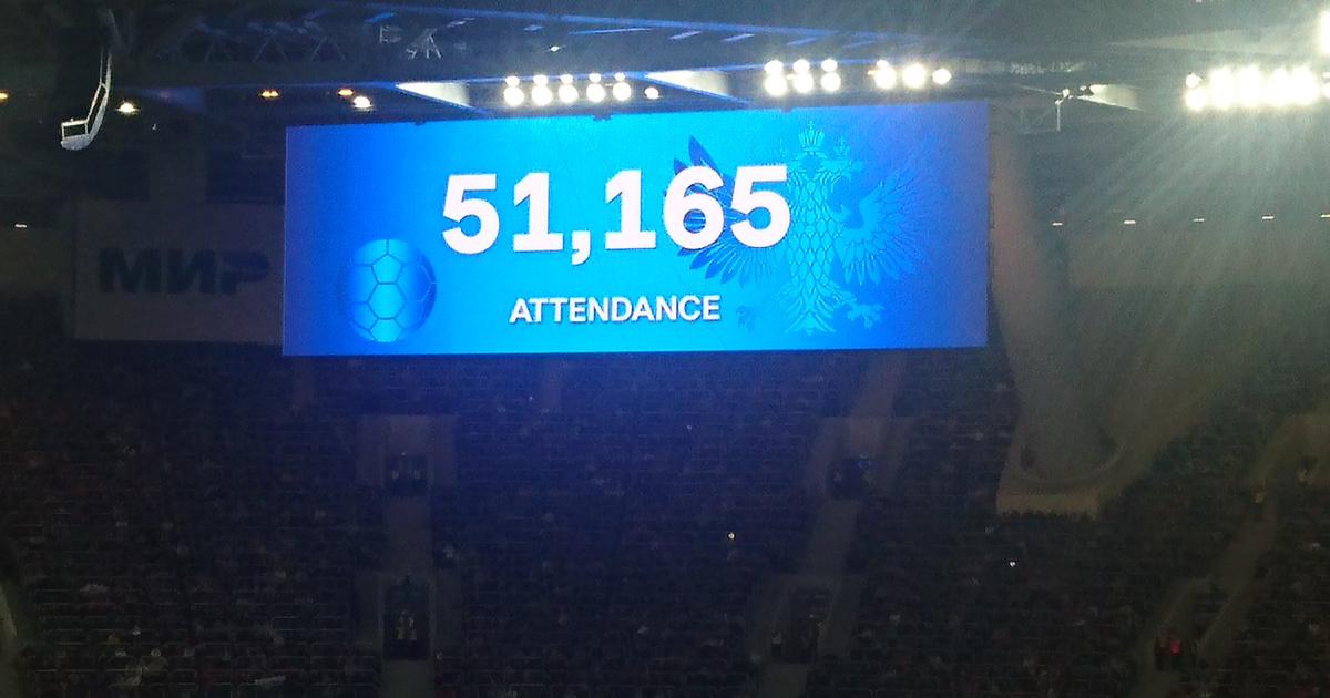Товарищеский матч между сборными России и Франции на стадионе «Крестовский» в Санкт-Петербурге посетили 51165 зрителей.