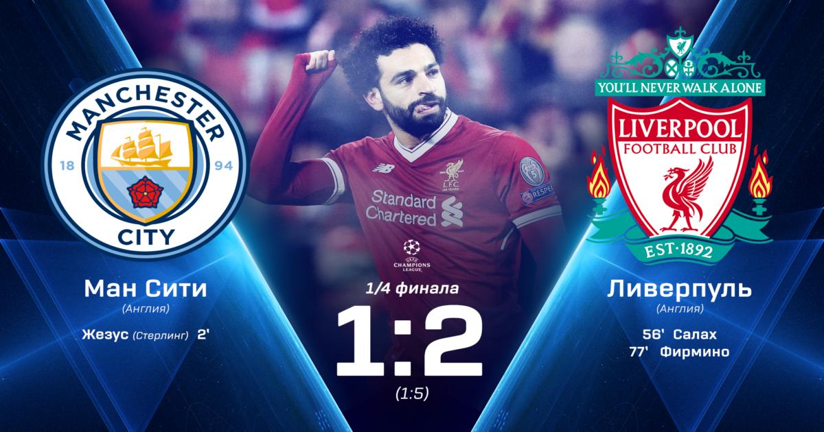 В ответном матче 1/4 финала Лиги чемпионов «Манчестер Сити» проиграл «Ливерпулю» (1:2).
