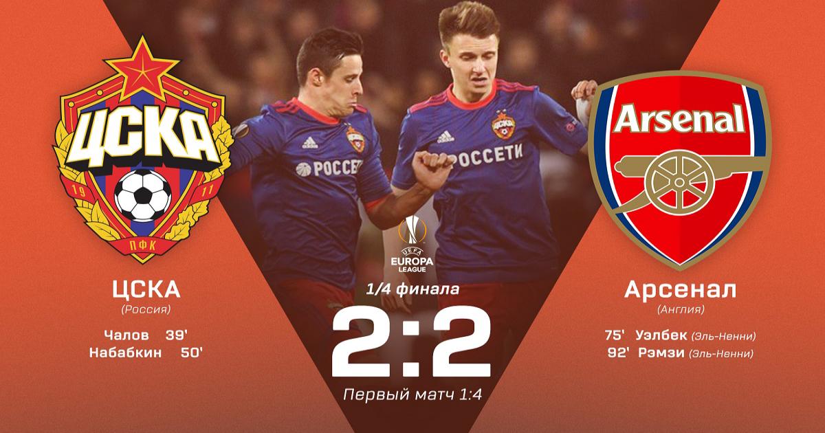 В ответном матче 1/4 финала Лиги Европы ЦСКА сыграл вничью с «Арсеналом» (2:2), но выбыл из турнира.