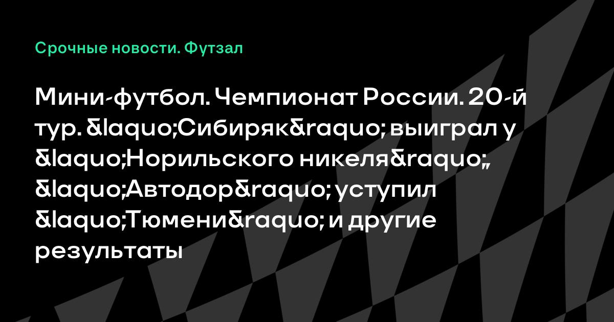 Сегодня прошли заключительные матчи 20-го тура чемпионата России по мини-футболу. «Сибиряк» выиграл у «Норильского никеля» (5:2), «Тюмень» оказалась сильнее «Автодора» (3:2).