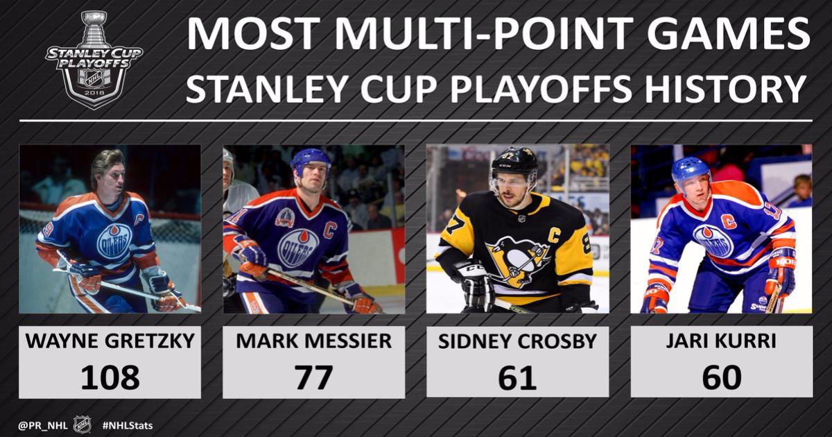 Таким образом, Кросби обошел Яри Курри (60 матчей) и вышел на 3-е место по количеству таких матчей в истории НХЛ.