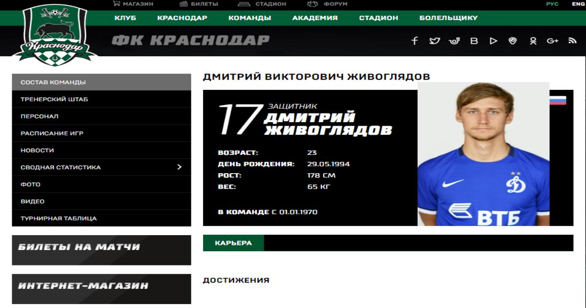На странице приведены данные Живоглядова, а также дата, с которой он якобы выступает за клуб: 01.01.1970.