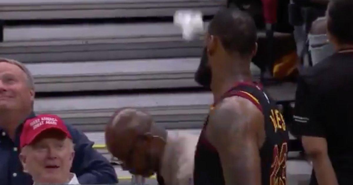 LeBron James deliberately throws towel beyond the reach of hopeful Trump supporter in the front row.