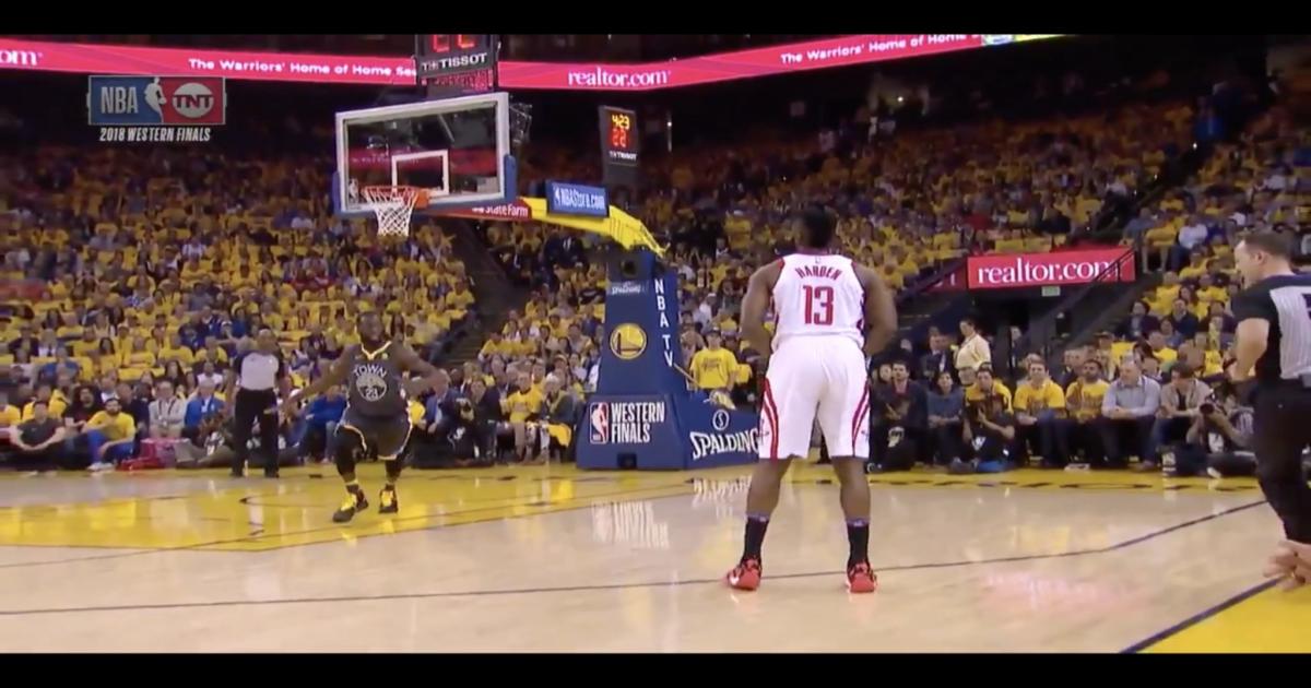 Харден оставался в одиночестве на дуге в течение нескольких секунд, но упустил момент и после приближения Дрэймонда Грина отдал мяч Пи Джей Такеру на другую сторону.