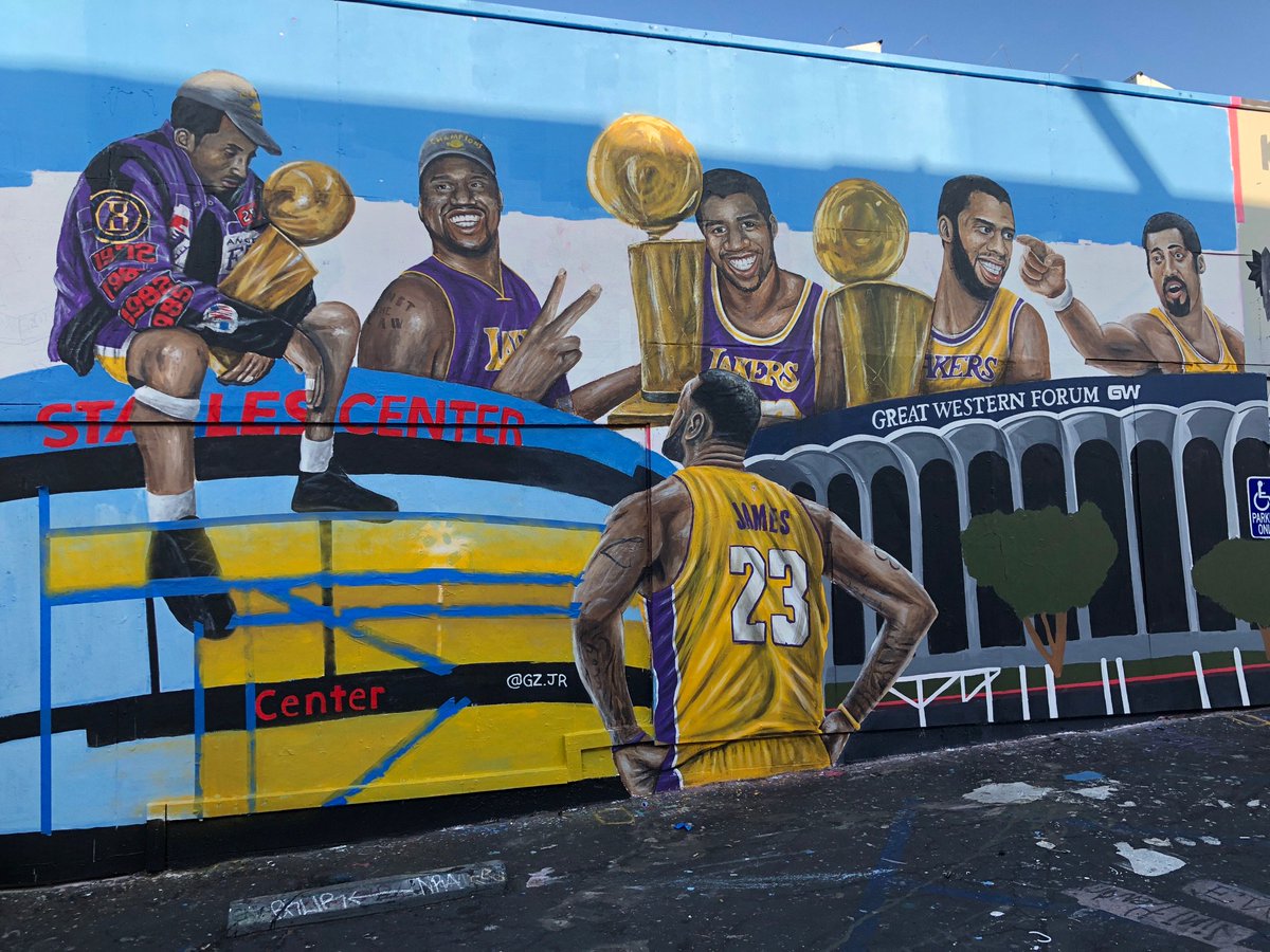 В Лос-Анджелесе появилось еще одно граффити в честь новобранца «Лейкерс» Леброна Джеймса. На нем он оказывается в компании с легендами клуба: Кобе Брайантом, Шакилом О’Нилом, Каримом Абдул-Джаббаром, Мэджиком Джонсоном и Уилтом Чемберленом.