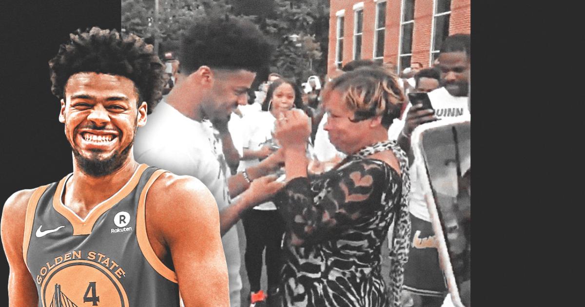 Разыгрывающий «Уорриорз» Куинн Кук сделал сюрприз для своей мамы во время баскетбольного лагеря в Вашингтоне.