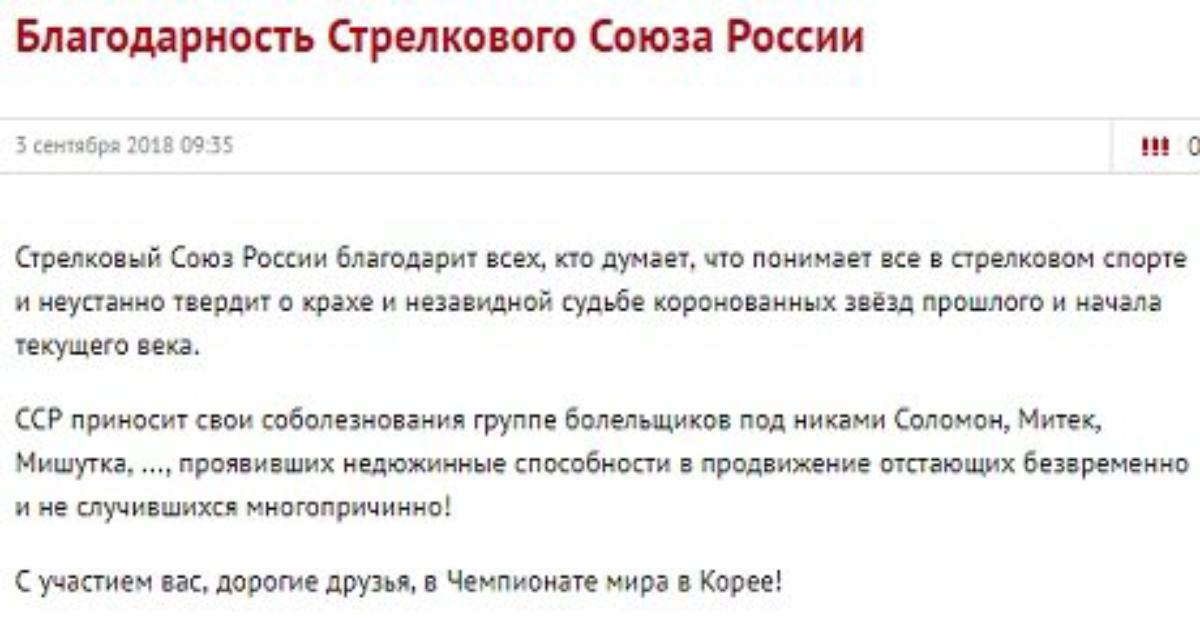 Стрелковый союз России: «Приносим соболезнования болельщикам под никами Соломон, Митек и Мишутка, которые твердят о крахе нашего спорта»