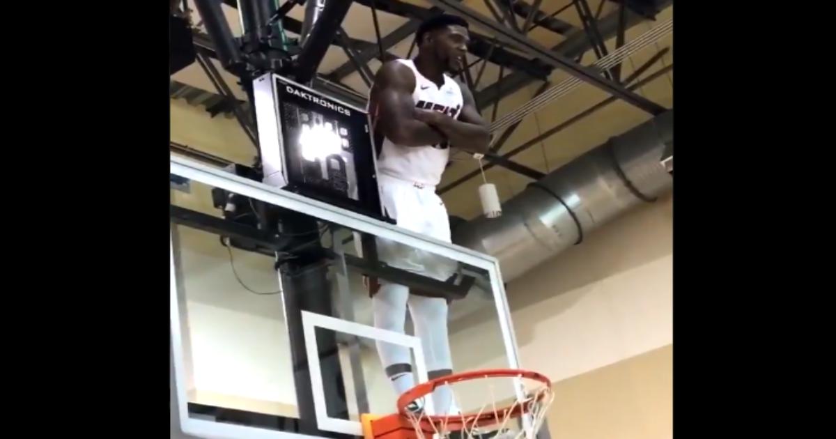 Форвард «Майами» Юдонис Хаслем залез на кольцо во время медиа-дня команды.