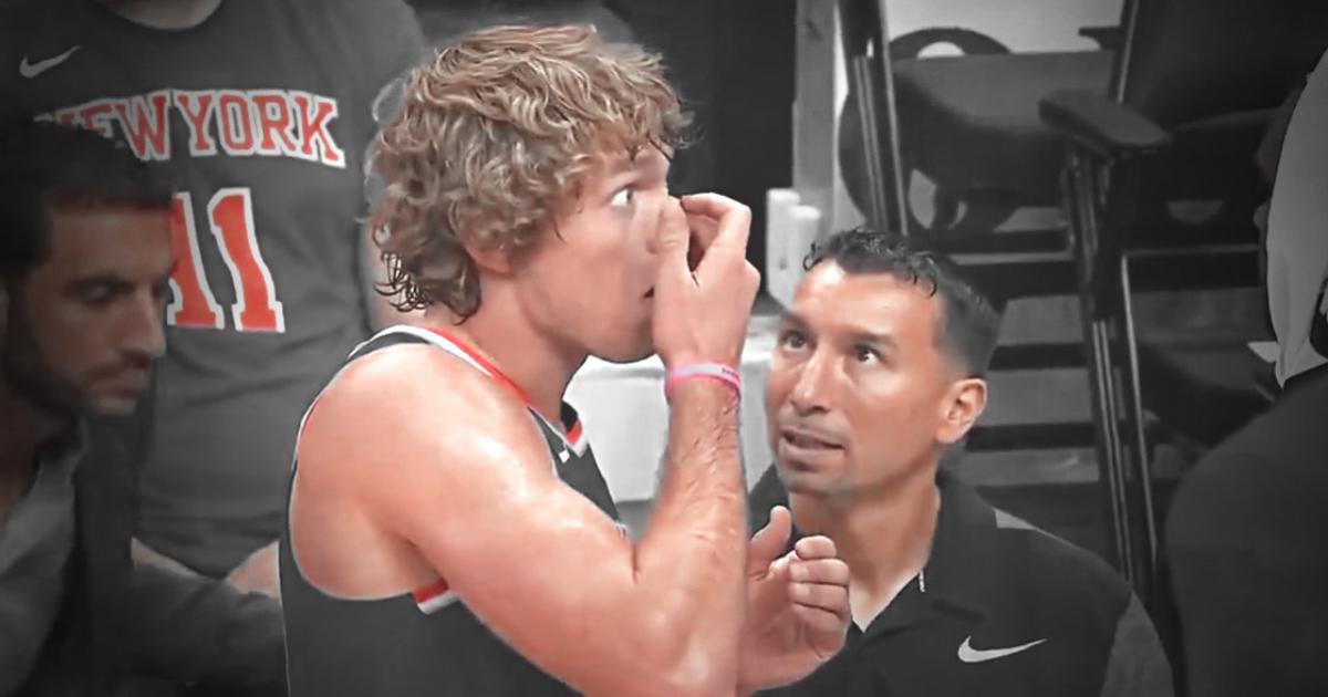 Защитник «Никс» Рон Бэйкер вставил выпавшую контактную линзу в паузе предсезонного матча с «Вашингтоном» (124:121 ОТ).