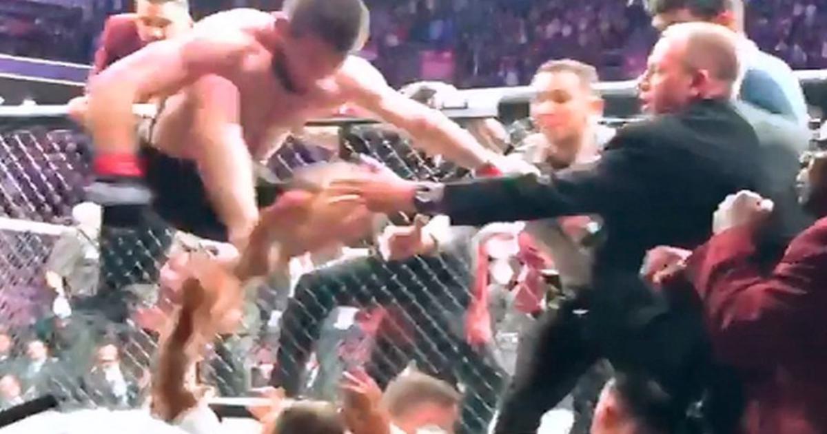 Сразу после победы над Конором Хабиб вылез из октагона и побежал к спарринг-партнеру ирландца Дилону Дэнису. Члены его команды тем временем напали на самого МакГрегора.