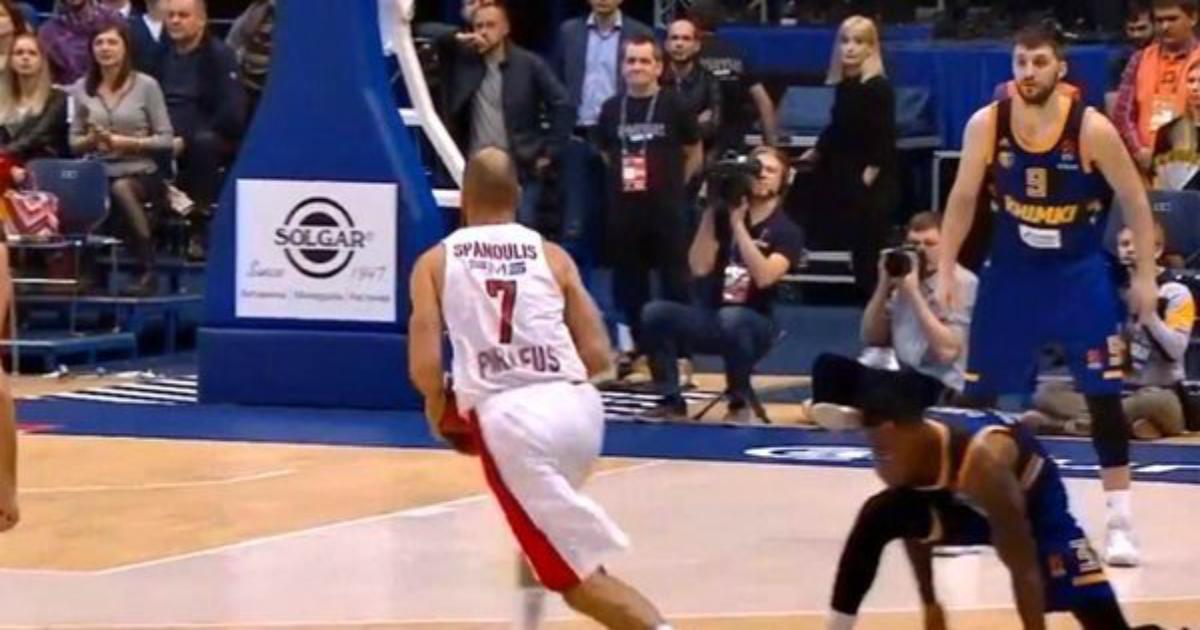 Разыгрывающий «Олимпиакоса» Вассилис Спанулис стал автором эффектного «баззера» на исходе второй четверти матча Евролиги с «Химками».