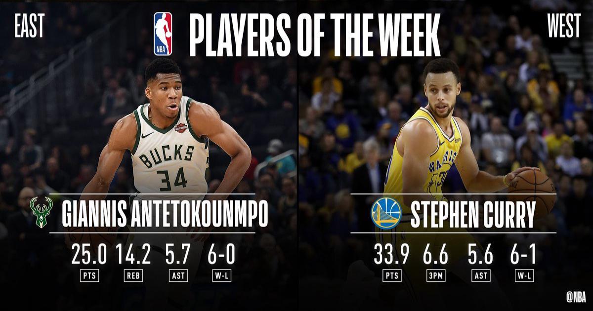Форвард «Милуоки» Яннис Адетокумбо и разыгрывающий «Уорриорз» Стеф Карри признаны игроками недели в Восточной и Западной конференциях НБА соответственно.