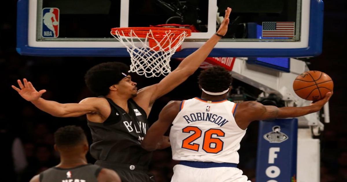 Центровой «Бруклина» Джарретт Аллен исполнил мощный данк через новичка «Нью-Йорка» Митчелла Робинсона, но спустя всего 10 секунд получил симметричный ответ от Ноа Вонле.