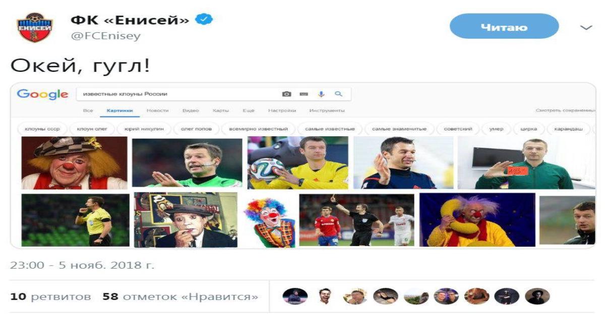 После матча «Енисей» опубликовал в твиттере запись, в которой в поисковике на запрос «известные клоуны России» якобы выдаются фотографии Матюнина.