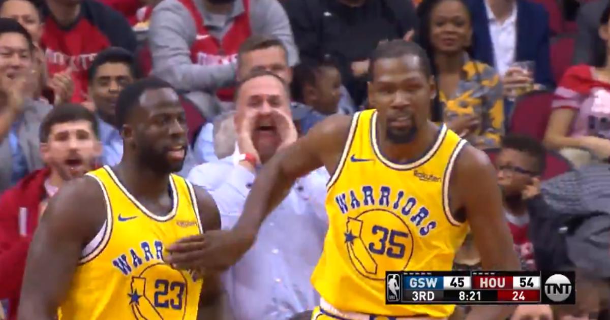 Форварды «Уорриорз» Кевин Дюрэнт и Дрэймонд Грин поприветствовали друг друга во время матча с «Хьюстоном».