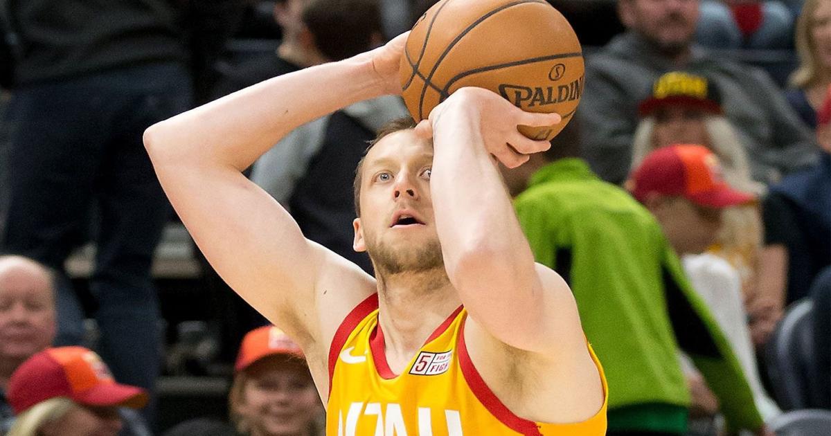 Форвард «Юты» Джо Инглс забросил мяч в кольцо, отдавая передачу на центрового Руди Гобера.