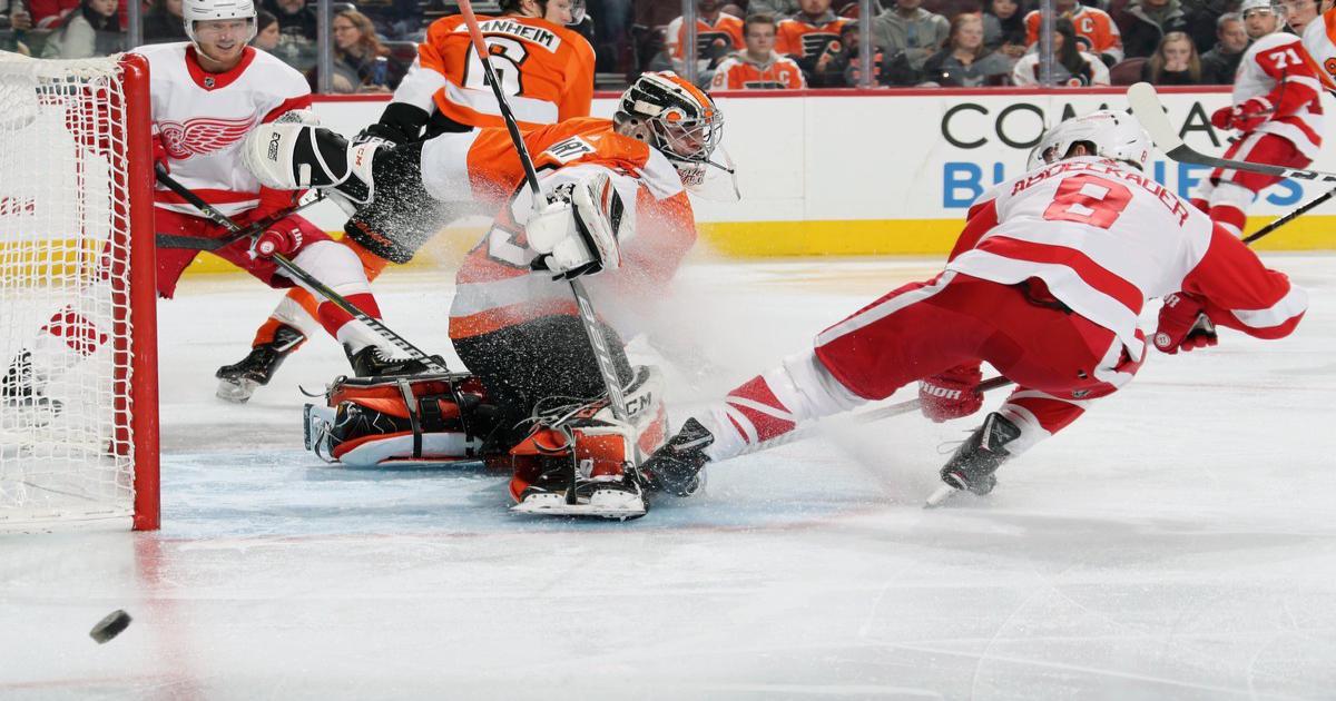 Голкипер «Филадельфии» Картер Харт выиграл свой дебютный матч в НХЛ против «Детройта» (3:2).