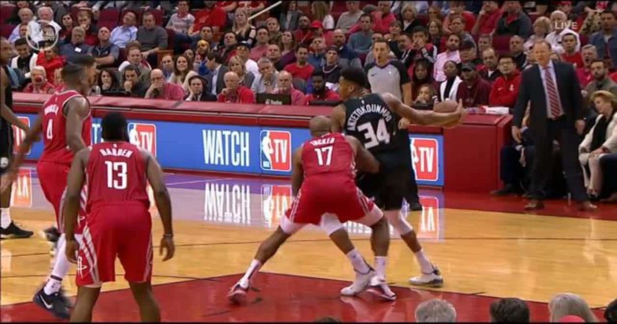 Форвард «Милуоки» Яннис Адетокумбо попал мячом в голову защитника «Рокетс» Джеймса Хардена.