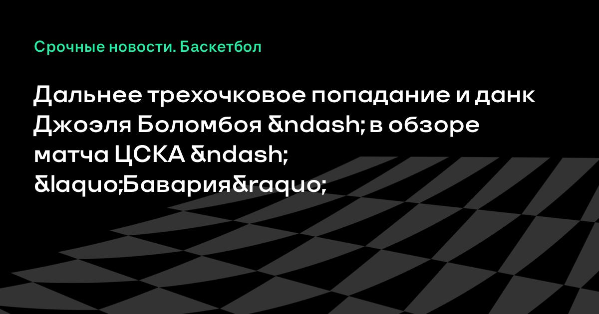 17 января 2019, 23:28 Дальнее трехочковое попадание и данк Джоэля Боломбоя – в обзоре матча ЦСКА – «Бавария» Дальнее трехочковое попадание и данк Джоэля Боломбоя – в обзоре матча Евролиги ЦСКА – «Бавария» (77:70). ВИДЕО Баскетбол ЦСКА Евролига Баскетбол - видео Бавария Джоэл Боломбой