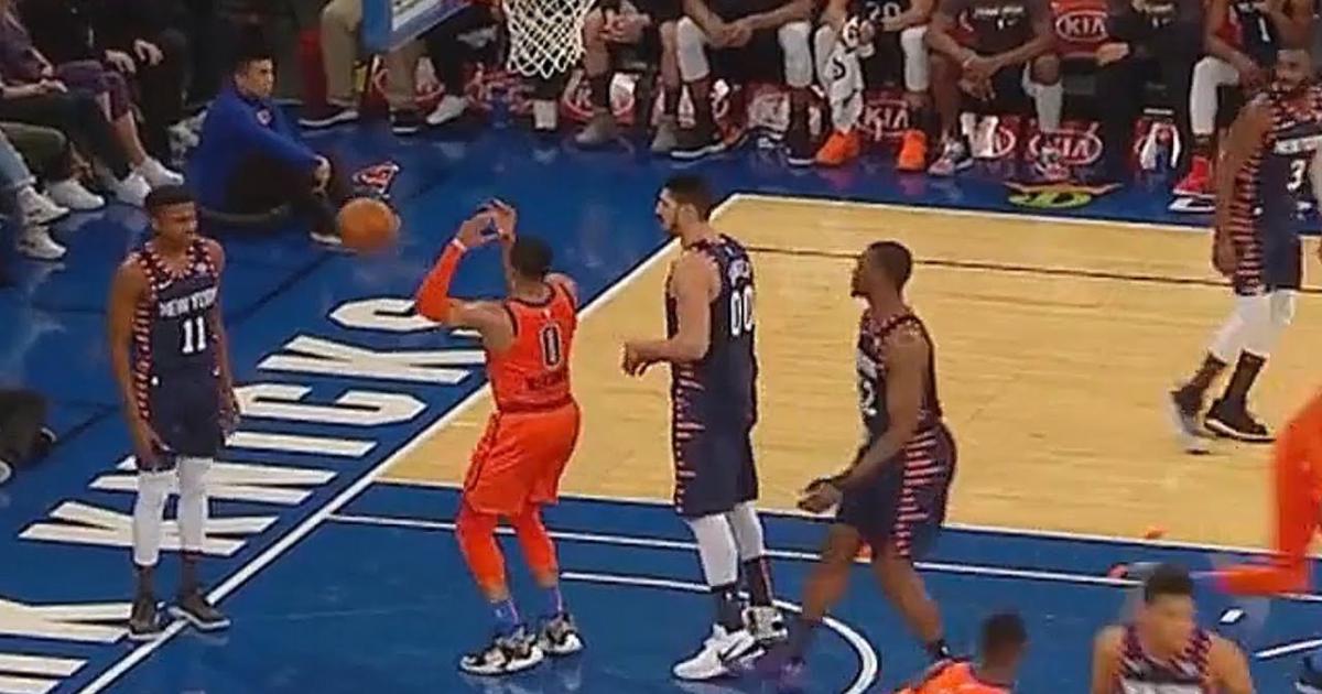 Разыгрывающий «Тандер» Расселл Уэстбрук обманул коллегу по амплуа из «Никс» Франка Ниликину с помощью памп фейка.