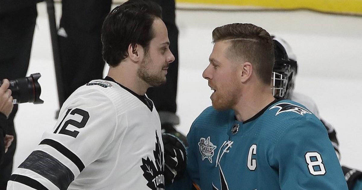 Нападающий «Торонто» Остон Мэттьюс принял участие в конкурсе на точность броска на Матче звезд НХЛ в Сан-Хосе в свитере Патрика Марло.