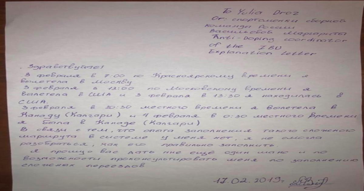 Российская биатлонистка Маргарита Васильева написала письмо на имя координатора WADA по России и объяснила, почему пропустила три допинг-теста.