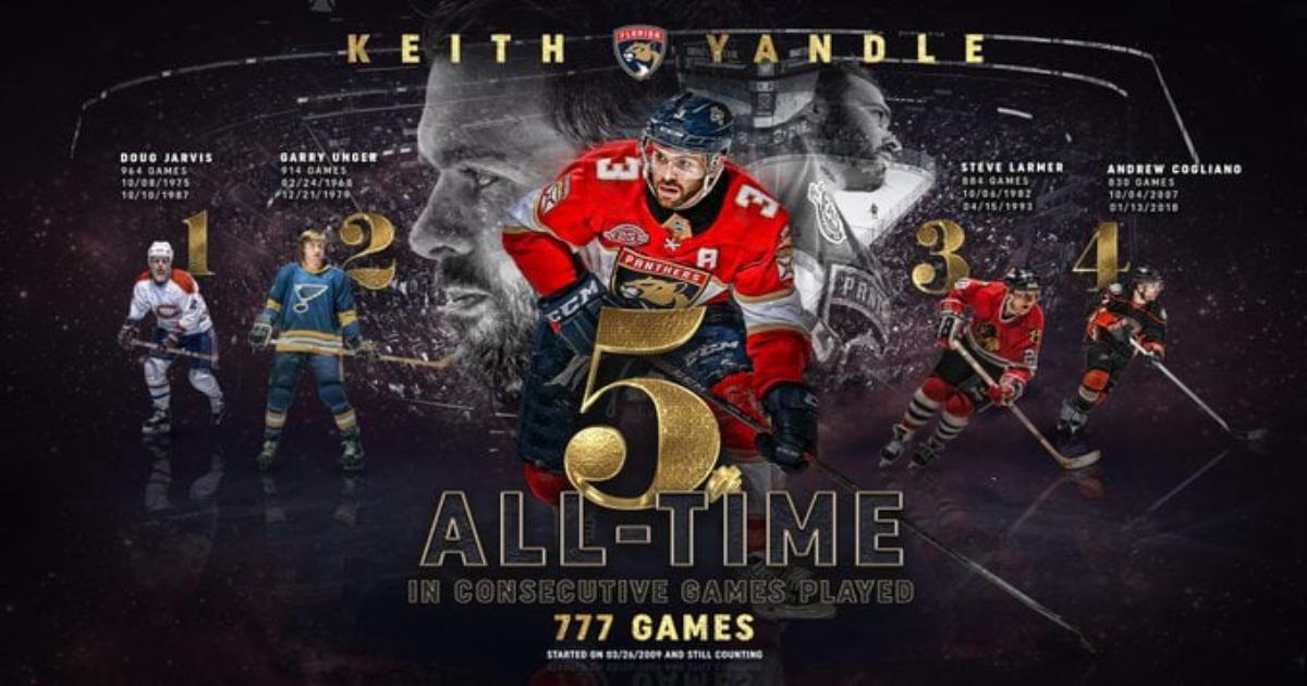 Tonight vs. ARI, #FlaPanthers defenseman Keith Yandle is competing in his 777th consecutive @NHL game, passing Craig Ramsay (776) for sole possession of the fifth-longest consecutive games played streak in NHL history. pic.twitter.com/1eBEEX8DFN