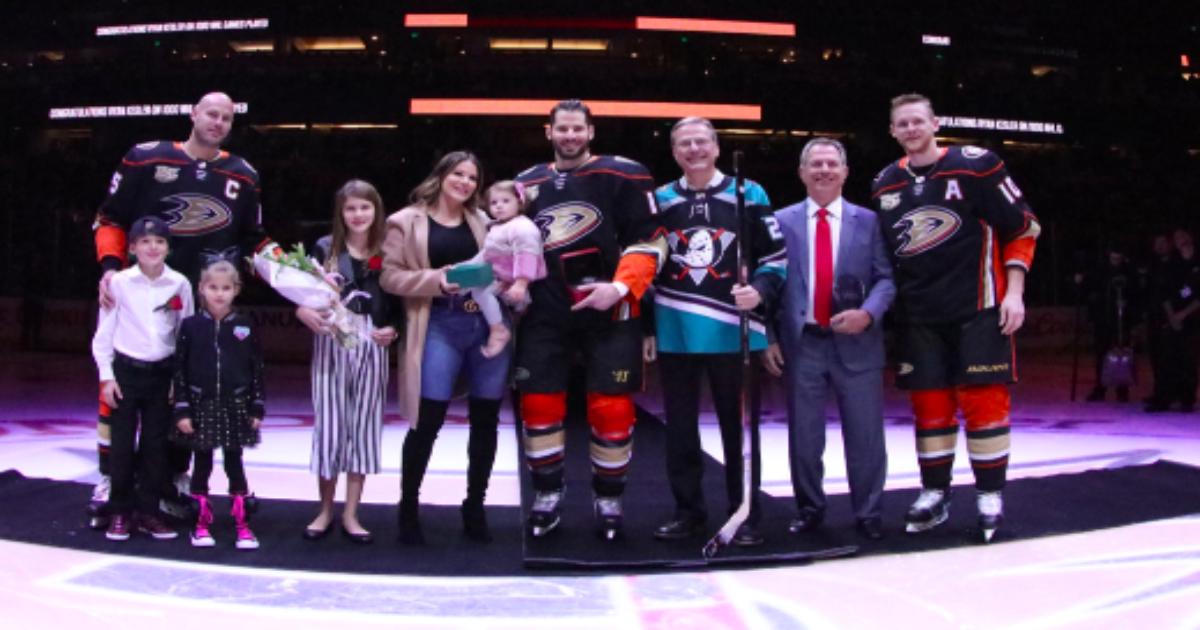 В честь этого «Анахайм» устроил торжественную церемонию, на которой 34-летнему форварду вручили серебряную клюшку, часы и другие подарки.