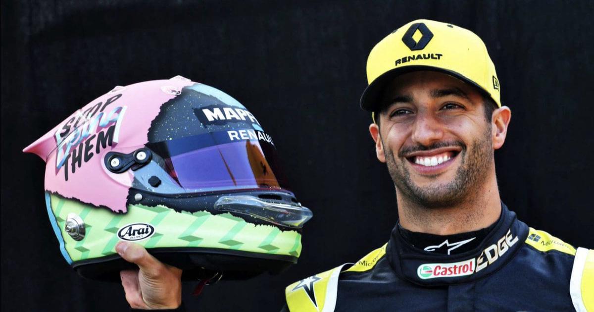 Пилот «Рено» Даниэль Риккардо показал шлем на сезон-2019, выполненный преимущественно в розовом, салатовом и голубом цветах.