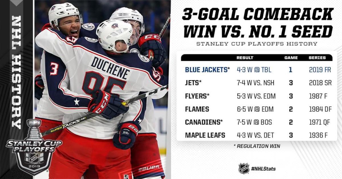 «Блю Джекетс» стали шестым в истории плей-офф клубом, взявшим верх над победителем регулярного чемпионата после того, как отыграл не менее трех шайб.